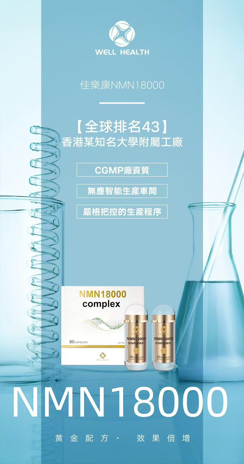 Well Health NMN 18000 Complex 產品規格: 60粒/盒 (買1送1) 商品介紹: Well Health佳樂康 NMN 18000 Complex 黃金配方