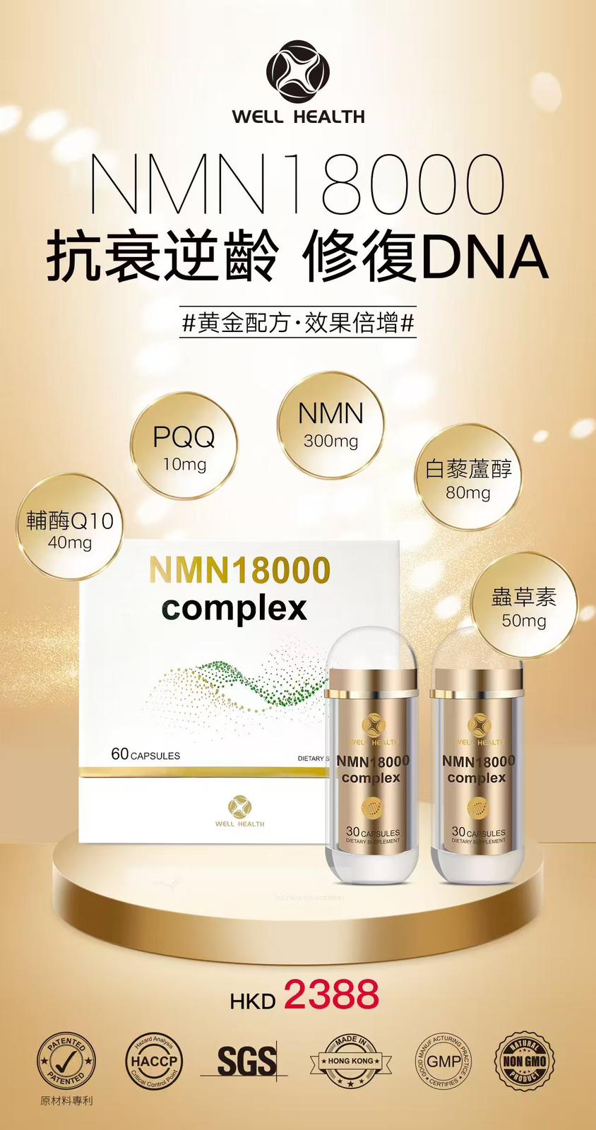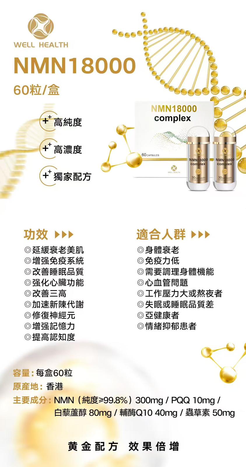 Well Health NMN 18000 Complex 產品規格: 60粒/盒 (買1送1) 商品介紹: Well Health佳樂康 NMN 18000 Complex 黃金配方